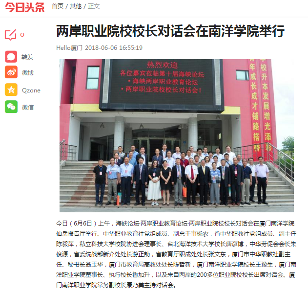 今日(6月6日)上午,海峡论坛·两岸职业教育论坛·两岸职业院校校长对话会在37000v威尼斯仙岳报告厅举行。中华职业教育社党组成员、副总干事杨农,省中华职教社党组成员、副主任陈毅萍,私立科技大学校院协进会理事长、台北海洋技术大学校长唐彦博,中华劳促会会长朱俊源,省委统战部新介处处长游正劼,省教育厅职成处处长张文东,厦门市中华职教社副主任、秘书长翁玉华,厦门市教育局高教处处长陈哲新,厦门南洋职业学院校长王豫生,厦门南洋职业学院董事长、执行校长鲁加升,以及来自两岸的200多位职业院校校长出席对话会。厦门南洋职业学院常务副校长康乃美主持对话会。