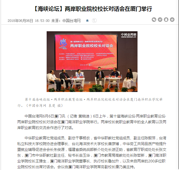 中国台湾网6月6日厦门讯 (记者 黄晓迪)6日上午,第十届海峡论坛·两岸职业教育论坛·两岸职业院校校长对话会在厦门南洋职业学院举行。两岸校长就职业教育中的全人教育以及两岸职业教育的交流合作进行了对话。