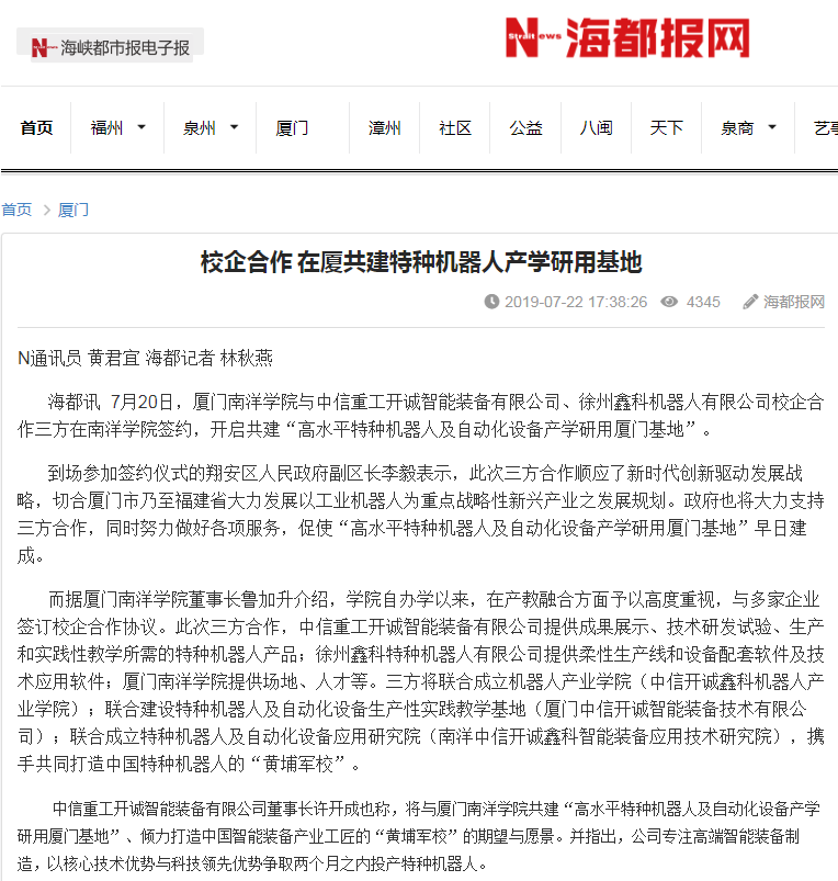 海都讯 7月20日,37000v威尼斯与中信重工开诚智能装备有限公司、徐州鑫科机器人有限公司校企合作三方在南洋学院签约,开启共建“高水平特种机器人及自动化设备产学研用厦门基地”。