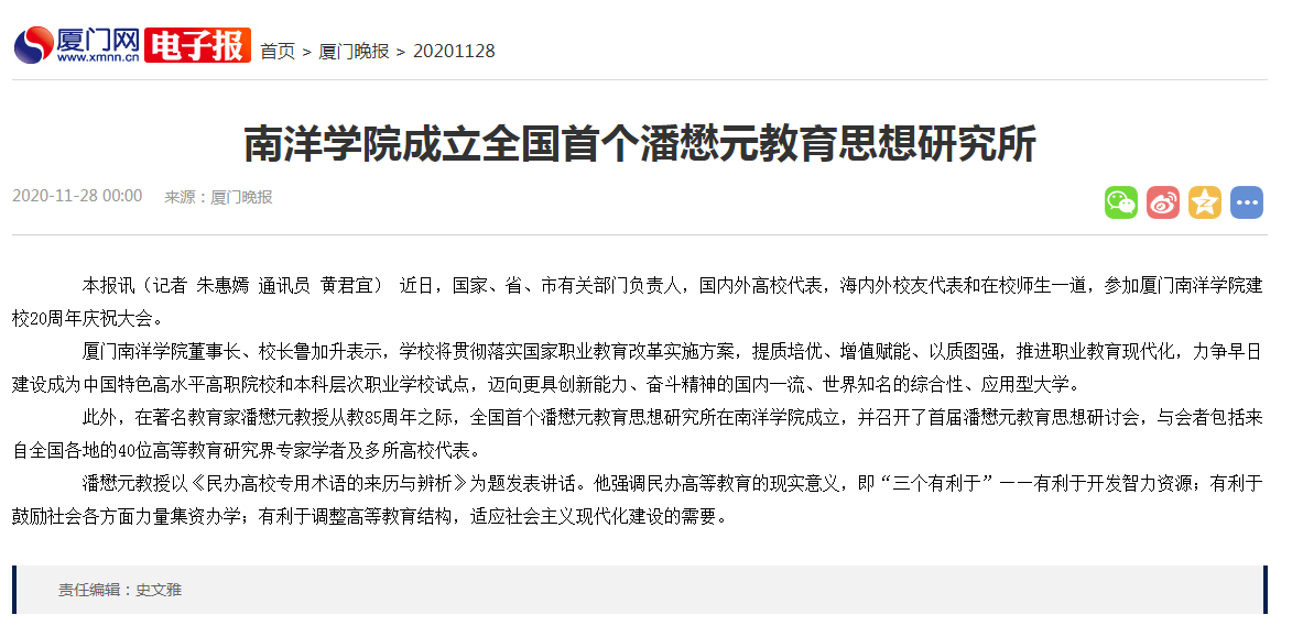 厦门晚报:南洋学院成立全国首个潘懋元教育思想研究所