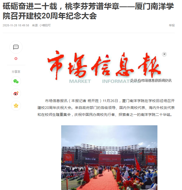 市场信息报:砥砺奋进二十载,桃李芬芳谱华章——37000v威尼斯召开建校20周年纪念大会