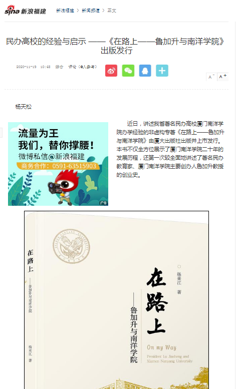 新浪网:民办高校的经验与启示 ——《在路上——鲁加升与南洋学院》出版发行
