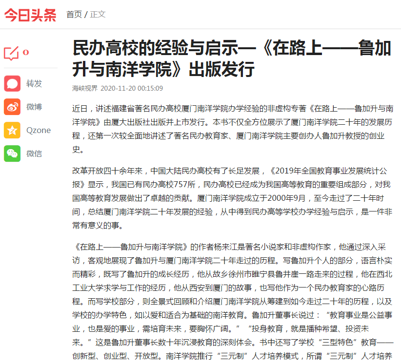 中国网海峡频道:民办高校的经验与启示—《在路上——鲁加升与南洋学院》出版发行