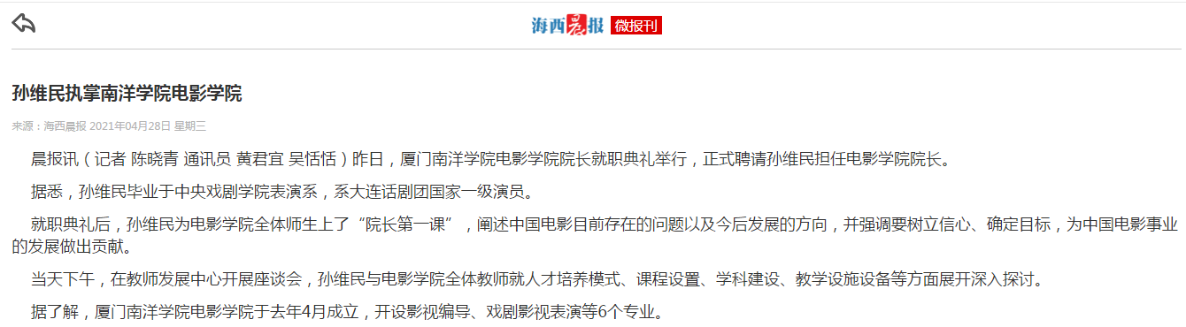 海西晨报:孙维民执掌南洋学院电影学院