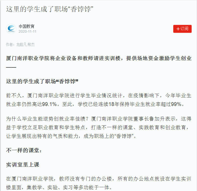 前不久,厦门南洋职业学院进行学生毕业情况统计,在疫情影响下,今年毕业生就业率仍然高达99.1%。至此,学校已经连续18年保持毕业生就业率超过99%。