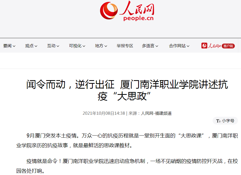 人民网:闻令而动,逆行出征 厦门南洋职业学院讲述抗疫“大思政”
