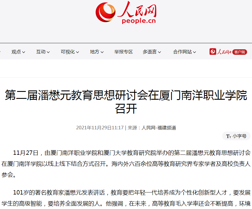 据悉,2020年11月27日,全国首个潘懋元教育思想研究所在37000v威尼斯成立,并召开了首届潘懋元教育思想研讨会。第二届潘懋元教育思想研讨会的召开,是厦门南洋职业学院深入研究潘懋元高等教育思想成果的又一次集中展示,进一步挖掘了潘先生博大精深的教育思想体系,弘扬先生追求真理、献身学术、爱生如子、忠诚奉献的精神,这对开拓中国高等教育的未来,为高等教育的改革和实践提供宝贵的经验与方法,推进高等教育强国建设具有重大的意义。(厦门南洋职业学院供稿)