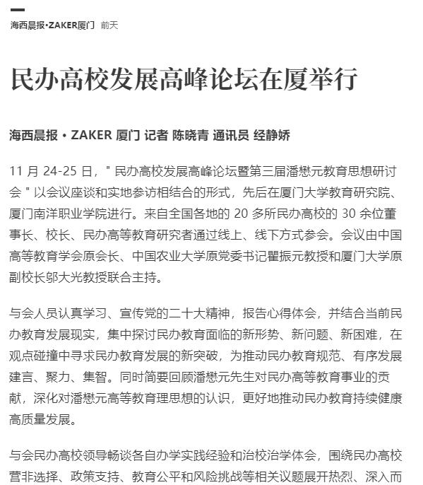 11 月 24-25 日," 民办高校发展高峰论坛暨第三届潘懋元教育思想研讨会 " 以会议座谈和实地参访相结合的形式,先后在厦门大学教育研究院、厦门南洋职业学院进行。来自全国各地的 20 多所民办高校的 30 余位董事长、校长、民办高等教育研究者通过线上、线下方式参会。会议由中国高等教育学会原会长、中国农业大学原党委书记瞿振元教授和厦门大学原副校长邬大光教授联合主持。