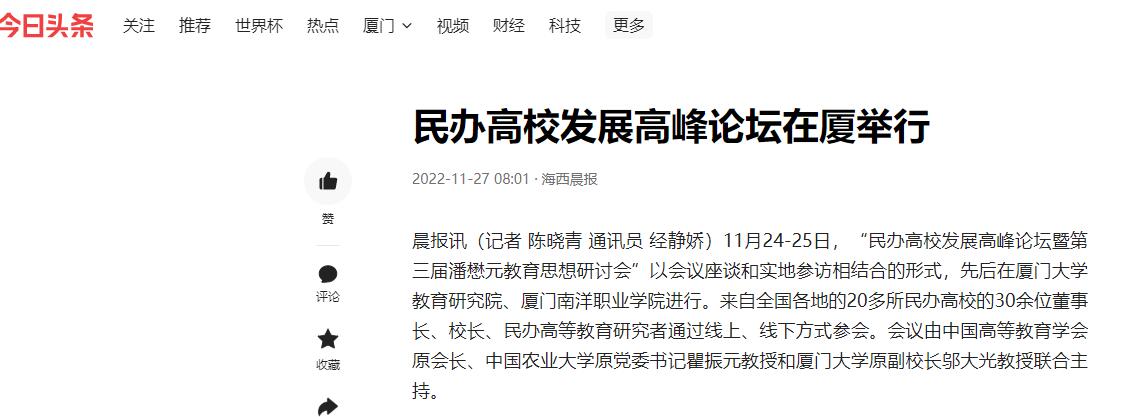 晨报讯(记者 陈晓青 通讯员 经静娇)11月24-25日,“民办高校发展高峰论坛暨第三届潘懋元教育思想研讨会”以会议座谈和实地参访相结合的形式,先后在厦门大学教育研究院、厦门南洋职业学院进行。来自全国各地的20多所民办高校的30余位董事长、校长、民办高等教育研究者通过线上、线下方式参会。会议由中国高等教育学会原会长、中国农业大学原党委书记瞿振元教授和厦门大学原副校长邬大光教授联合主持。