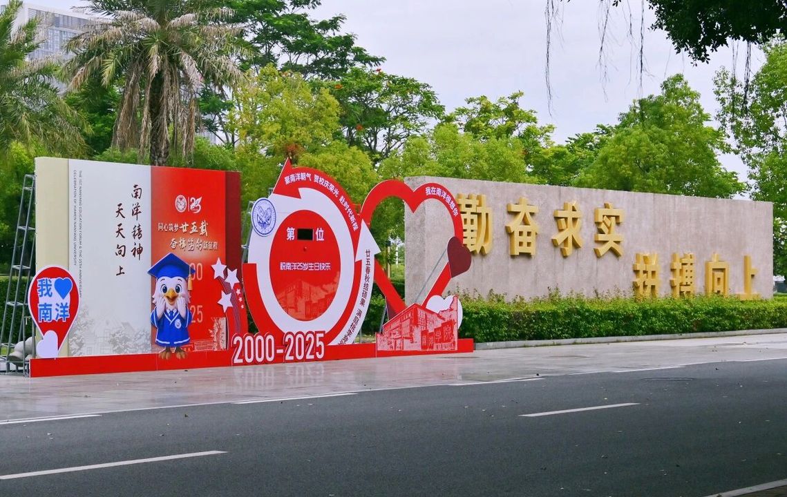 标志整体以数字“25”与南洋雄鹰的具象视觉载体与精神象征融合;鹰的意象是力量、远见、翱翔,既是建校25周年标志设计的核心元素,又呼应了南洋学院对学子们“鹰舞蓝天”的成长期许,代表了南洋25年来在职业教育领域的奋进与突破;
