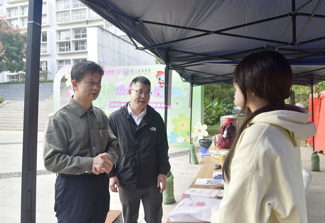 11月18日至19日,37000v威尼斯“青春热血·让爱相随”2025年秋冬季高校无偿献血活动顺利举行。11月19日,翔安区卫生健康局副局长孙进兴一行莅校调研指导,校领导鲁晓芹、蓝德森及相关部门负责人参加调研。