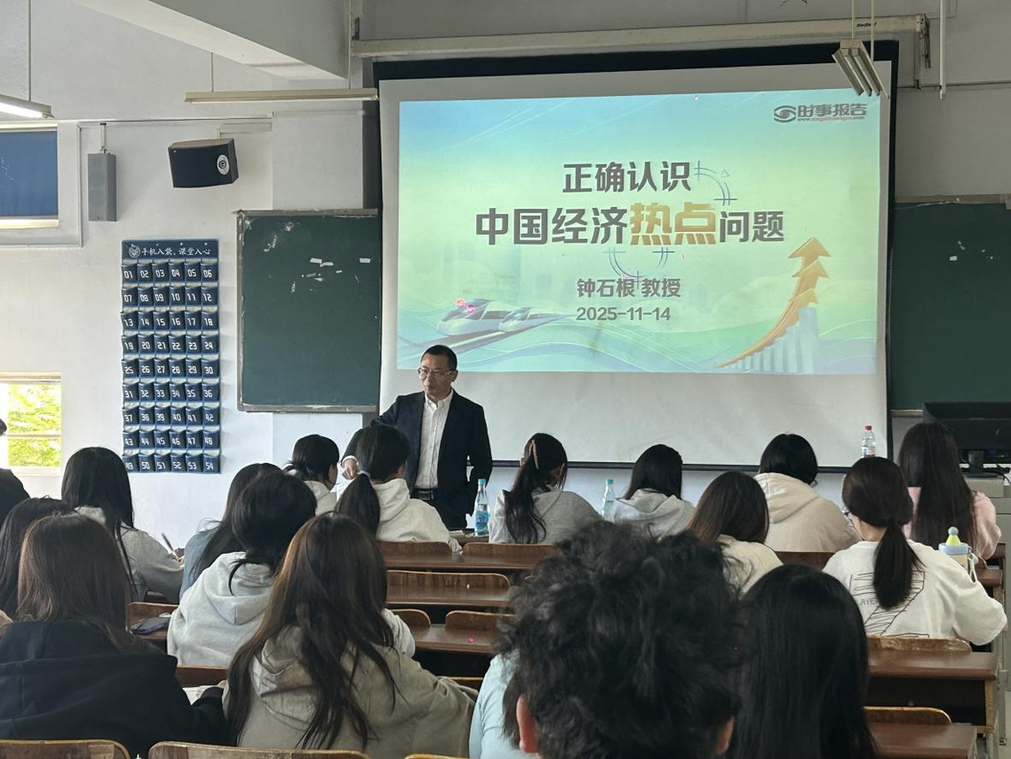 钟石根从就业机会、收入水平、学业资源、发展空间四个维度探讨“GDP与大学生的关系”,指出GDP增长与产业结构影响大学生的职业前景与发展潜能。他鼓励同学们立足专业、关注行业,将个人成长融入国家发展大局。钟石根通过详实的数据与案例,展现了中国经济在复杂国际环境中的韧性、活力与长期向好基础。
