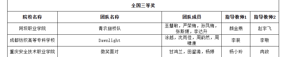 据悉,本届比赛参赛团队来自全国27个省、市、自治区的150所职业院校,共有275个参赛团队,最后评选出全国一等奖团队12个,全国二等奖团队15个,全国三等奖团队22个。