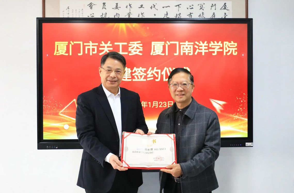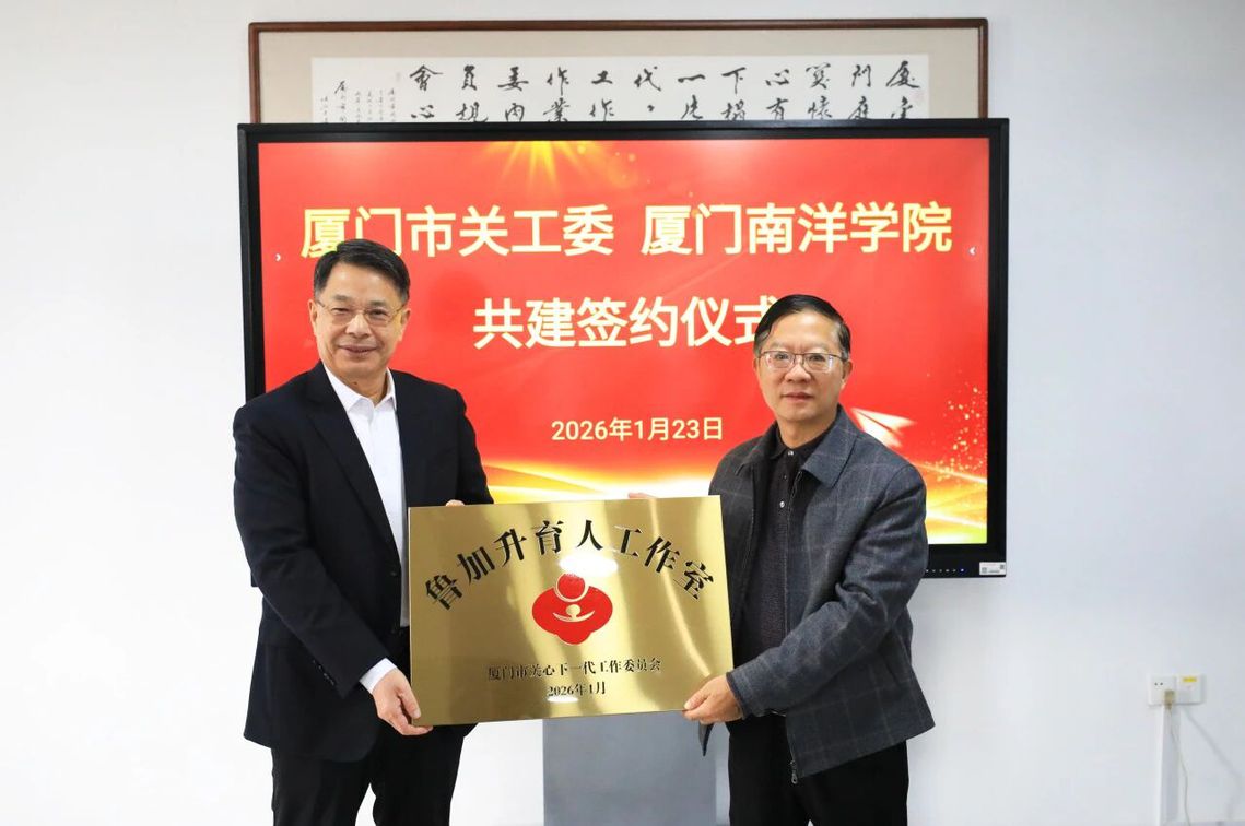 1月23日,厦门市关心下一代工作委员会(以下简称“市关工委”)与我校签订共建合作协议,市关工委主任、市委原副书记陈秋雄向我校创办人鲁加升教授授予“鲁加升育人工作室”牌匾,我校向陈秋雄颁发客座教授聘书。