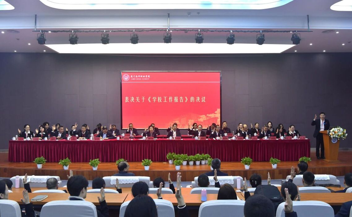 11组代表团分别围绕《学校工作报告》《工会工作报告》《厦门南洋职业学院教师分类发展与管理办法》《厦门南洋职业学院内涵建设奖励办法》进行审议。随后,全体主席团成员举行主席团第二次会议,听取和审议修改意见。在第二次全体会议上,全体代表表决通过关于《学校工作报告》《工会工作报告》《厦门南洋职业学院教师分类发展与管理办法》《厦门南洋职业学院内涵建设奖励办法》的决议。